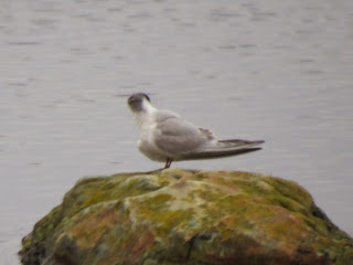 The bird had an obvious dark patch around the eye, and in flight didn't seem to have much duskiness along the nape connecting the two eye patches. The crown was white, the bill was dark and seemed thicker than that of a Common Tern. Also, the wings seemed broader based and didn't have that slender and angled-back look of a Common Tern which made it seem more like a Bonaparte's Gull - which is what we thought it was at first glance.